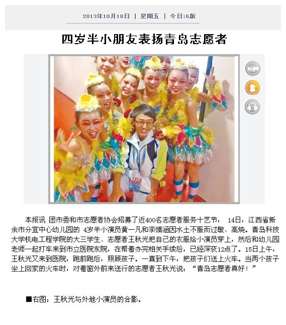 11月13日上午,机电学院分团委收到一封来自青岛港中旅(山东)旅行社有限公司的感谢信,信中表达了对我院学生机自114班任建桥同学服务第十届中国艺术节的感谢。