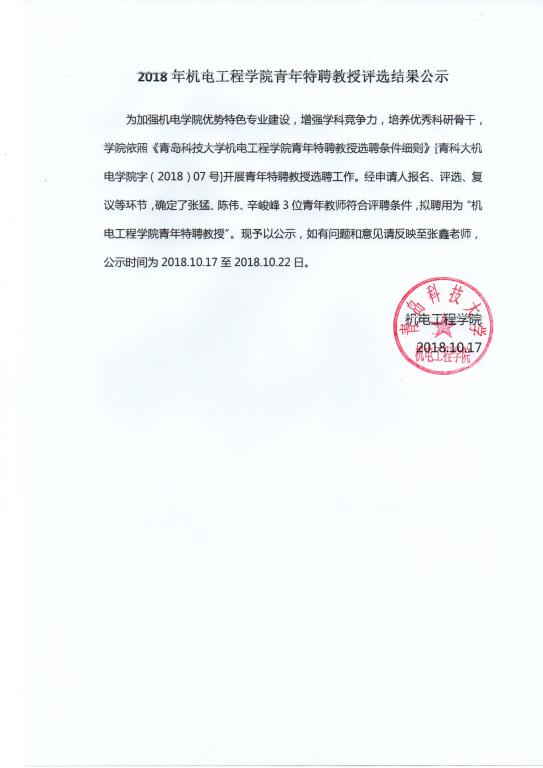 关于2018年机电工程学院青年特聘教授评选结果公示
