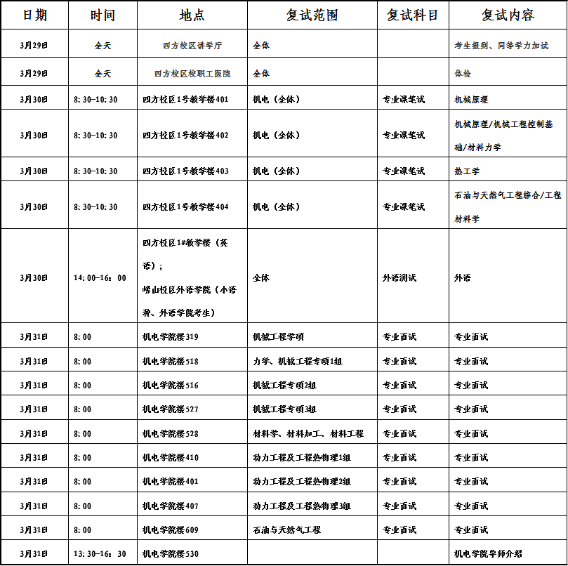 说明: 3月29日报到时,请在报到处--机电学院举牌位置填写报到登记详情表;3月30日专业课考试科目《机械原理》的考生请自带绘图工具;3月31日专业面试分组名单详见当天机电学院楼一楼张贴,各复试专业按照公布名单的顺序依次进行,政审表在面试时请交于各组政审老师;529房间为考生面试候场处。