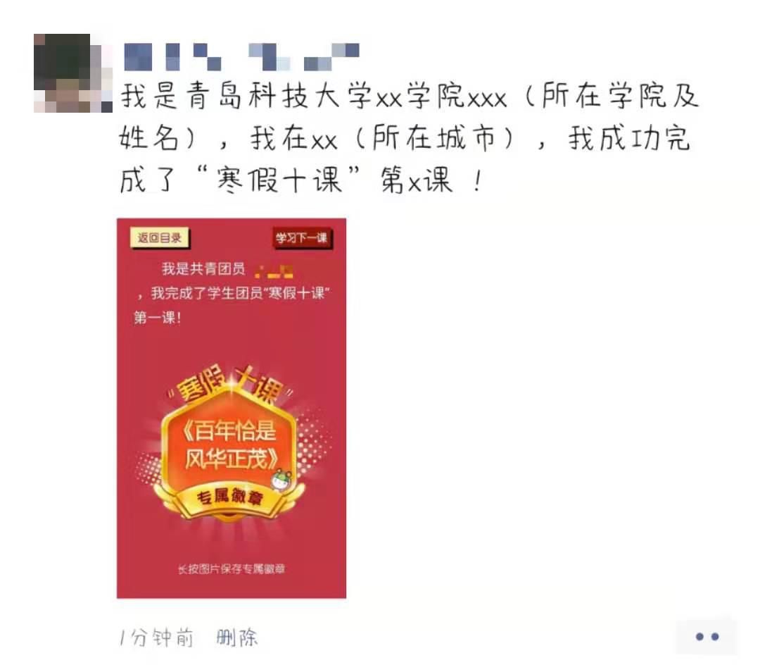 1、建议各团支部鼓励团员微信朋友圈截图,具体内容为“我是青岛科技大学xx学院xxx(所在学院及姓名),我在xx(所在城市),我成功完成了“寒假十课”第x课!”,详情请见下图