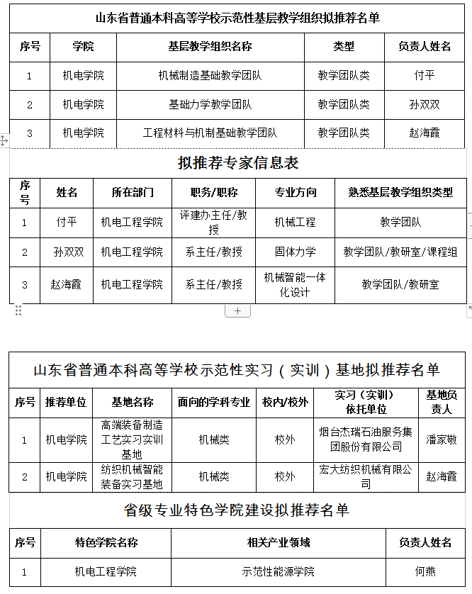 依据学校《关于开展省级未来技术学院、专业特色学院、示范性基层教学组织、实验教学示范中心、虚拟仿真实验教学示范中心、示范性实习(实训)基地、“111”计划建设申报的通知》,学院组织符合条件的教师申报,经学院初审,现拟推荐以下项目类别和人员,进入学校评审环节,并进行公示。公示期三天(2023年12月4日-12月6日),如有异议,请在公示期内向机电工程学院教学办反映。