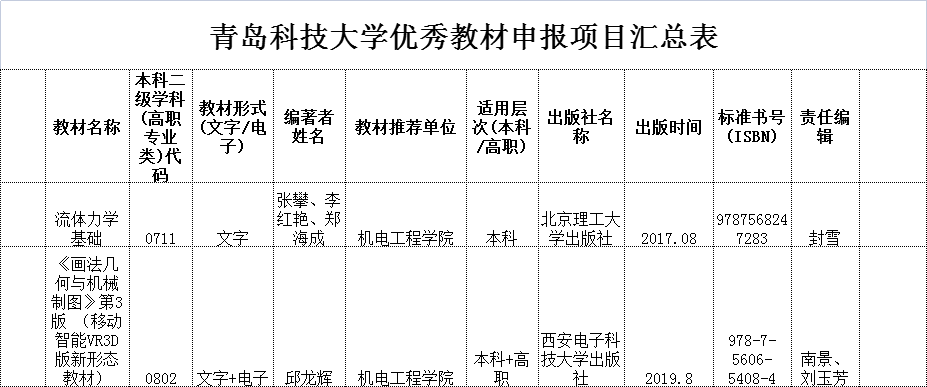 根据学校《青岛科技大学关于开展2021年优秀教材评选工作的通知》要求,经教材编著者申报,学院共推荐优秀教材2项,现将名单公示如下: