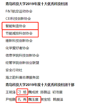 6月2日,青岛科技大学2019年度十大优秀科技社团和优秀科技社团干部名单公示,机电学院指导的社团节能减排科创协会获评“十大优秀科技社团”,刁旭、魏玉展同学获评“十大优秀科技社团干部”,并推荐刁旭同学参评山东省优秀科技社团干部。高密校区机电系智能制造协会、孔尧同时入选。