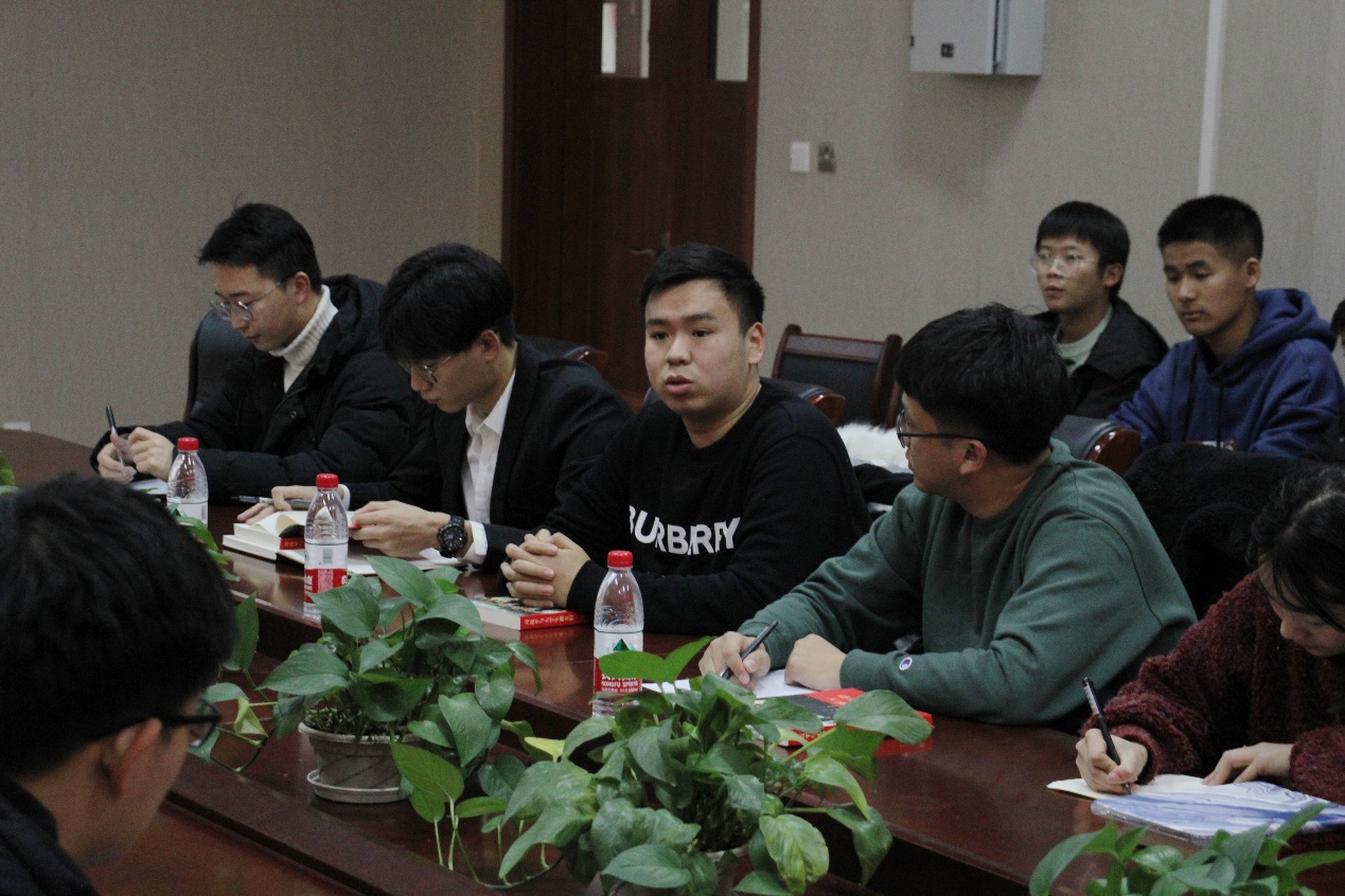 会上张皓越进行书目的领读,并提倡大家积极阅读书目,结合学校体育综合改革,进一步提升自己的文化素养和身体素质。李泓昭就寄语精神进行传达,表示《习近平与大学生朋友们》值得好好学习,认真研读,可以从书中学习到总书记的很多精神,希望大家可以认真感悟总书记所编写的书目,互相交流、互相帮助,更好的增强自身的政治思想。张致远发表了自己对书目的推荐及感悟,并表示加强校院两级的交流联系,提倡同学们多多参与校院活动,参与到学校、学院的发展中去。