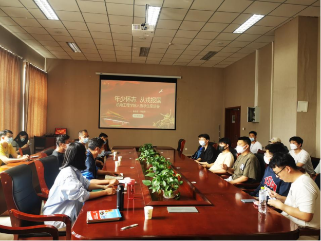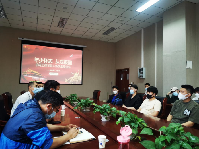 为响应国家号召,鼓励大学生毕业生投身社会主义强军、强国征途,机电工程学院开展了一系列征兵入伍工作。目前,毕业生基本完成应征入伍报名工作,即将开启体检流程。为进一步帮助毕业生解决入伍难题,解放思想负担,2022年6月9日,机电工程学院召开“年少怀志 从戎报国”机电工程学院入伍学生座谈会。出席本次座谈会的有学生工作处(武装部)副部长曹永俊老师、学生工作处(武装部)黄玉斌老师、机电工程学院党委副书记兼副院长肖强老师、毕业生辅导员、退伍学生代表及2022年预征兵入伍毕业生,座谈会由团委书记王作辉老师主持。