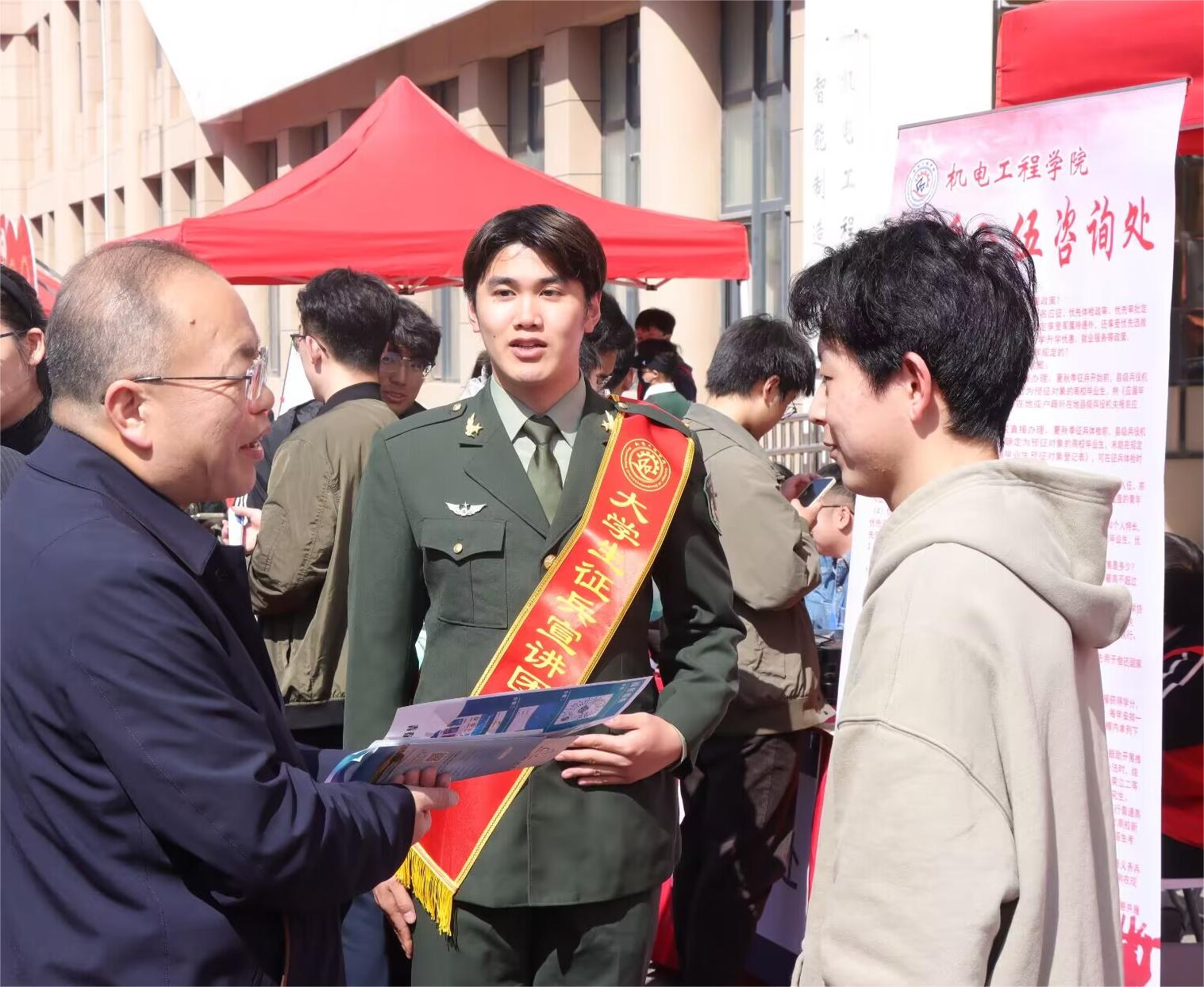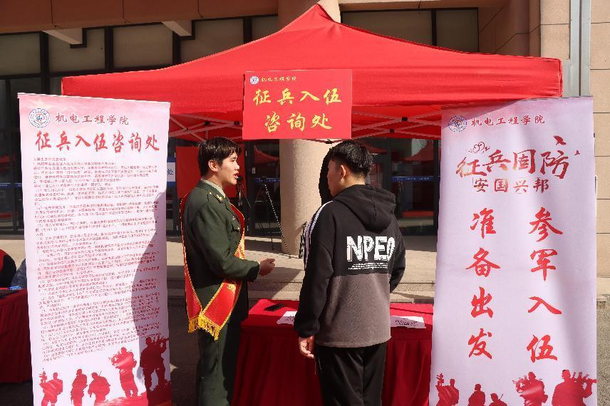 3月28日,机电工程学院在双选会现场设置“征兵入伍咨询处”,活动现场毕业生们主动咨询。特邀本校退伍士兵进行现场答疑,面对面地向同学们细致地解答了大学生参军入伍应征条件、应征流程、发展途径及相关优待政策等问题,勉励学生们将青春奉献于军营,将才华奉献于祖国,用青春和热血谱写人生最壮丽的诗篇,为建设和保卫祖国建功立业。
