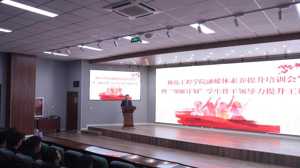 为进一步提升学生干部工作业务能力,加强学生队伍的凝聚力,进一步加强高校融媒体宣传水平。5月9日,机电工程学院在机电楼530室举办融媒体素养提升培训会暨“领雁计划”学生骨干领导力提升工程。会议由机电工程学院融媒体中心指导老师于超主持,机电工程学院学生会骨干成员,融媒体中心全体成员,21、22级团支书及宣传委员参加培训。