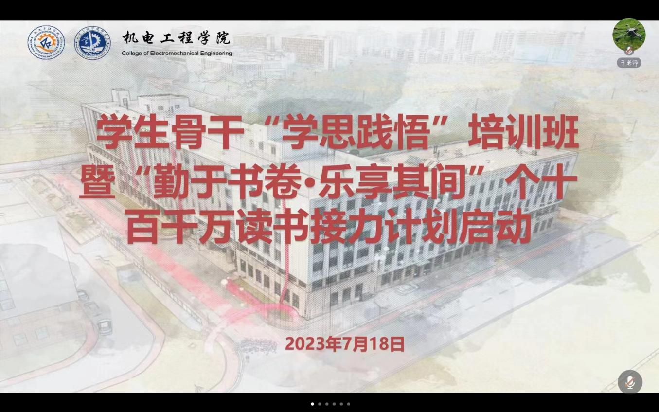 为提高学生骨干的政治素质、理论水平和实践能力,培养政治可靠、作风扎实的学生骨干队伍,促进学生全面发展、成长成才,7月18日,机电工程学院学生会召开学生骨干“学思践悟”培训班暨“勤于书卷·乐享其间”个十百千万读书接力计划启动仪式,学生会指导老师于超和全体学生骨干共同参会。