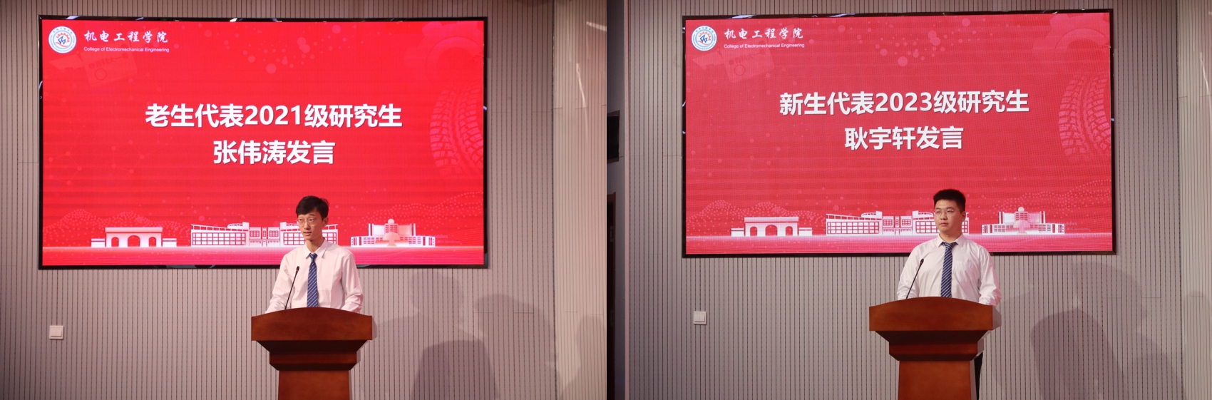 在校生代表2021级研究生张伟涛同学以自身经历分享研学经验,希望新同学们能够不负时代重托,不负青春韶华,勤奋学习、少走弯路。新生代表2023级研究生耿宇轩同学表示将谨记师兄师姐的教导和嘱托,自觉加强学习,不断增强本领,以专业所学致力服务于国家发展需要。