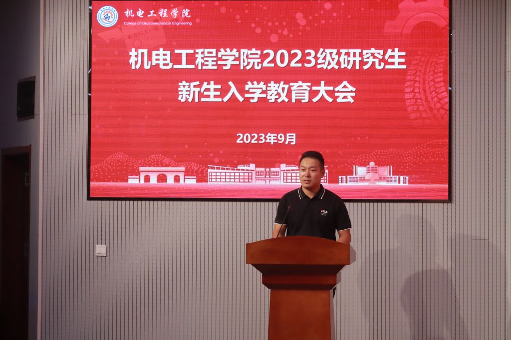 会上,机电工程学院党委副书记兼副院长肖强代表学院全体师生向2023级研究生新同学表示热烈欢迎和诚挚祝贺。他介绍了机电工程学院的基本情况及发展历史,结合自身经历为新同学分享了研究生求职经验,勉励新同学在研究生阶段再接再厉,为未来的职业发展奠定坚实基础。同时对2023级全体研究生提出三点要求:一是涵养家国情怀,砥砺强国之志;二是坚持勤学苦练,提升能力本领;三是增强创新意识,培养创新思维。