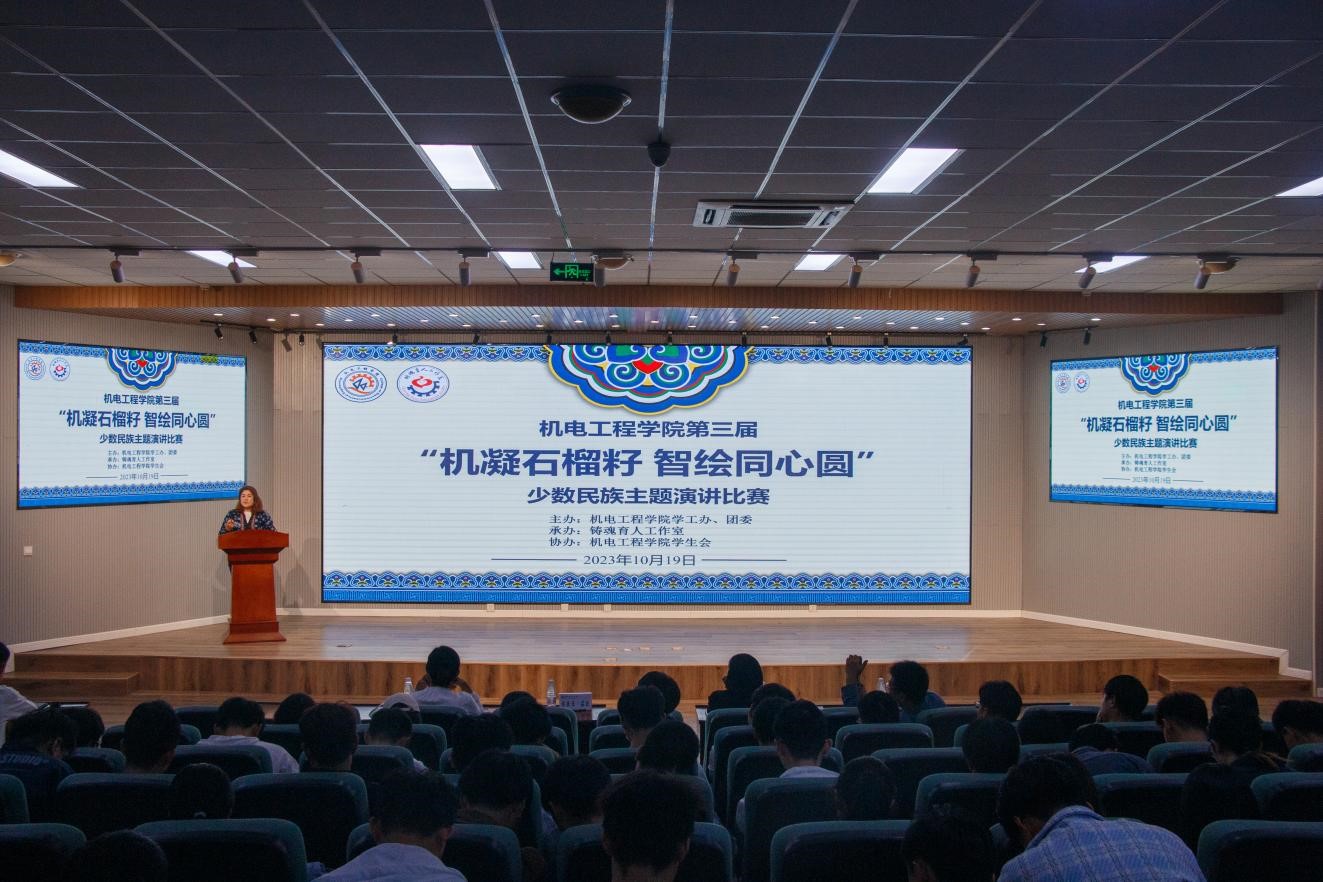 为深入开展学习贯彻习近平新时代中国特色社会主义思想主题教育,进一步加强爱党爱国教育、民族团结进步教育,引导我院各民族青年学生铸牢中华民族共同体意识,10月19日,机电学院第三届“机凝石榴籽 智绘同心圆”少数民族主题演讲比赛在机电学院530报告厅举行。学院学工办主任王娟娟、少数民族专职辅导员热孜亚·茹孜、新生辅导员、青马学员参加此次活动。