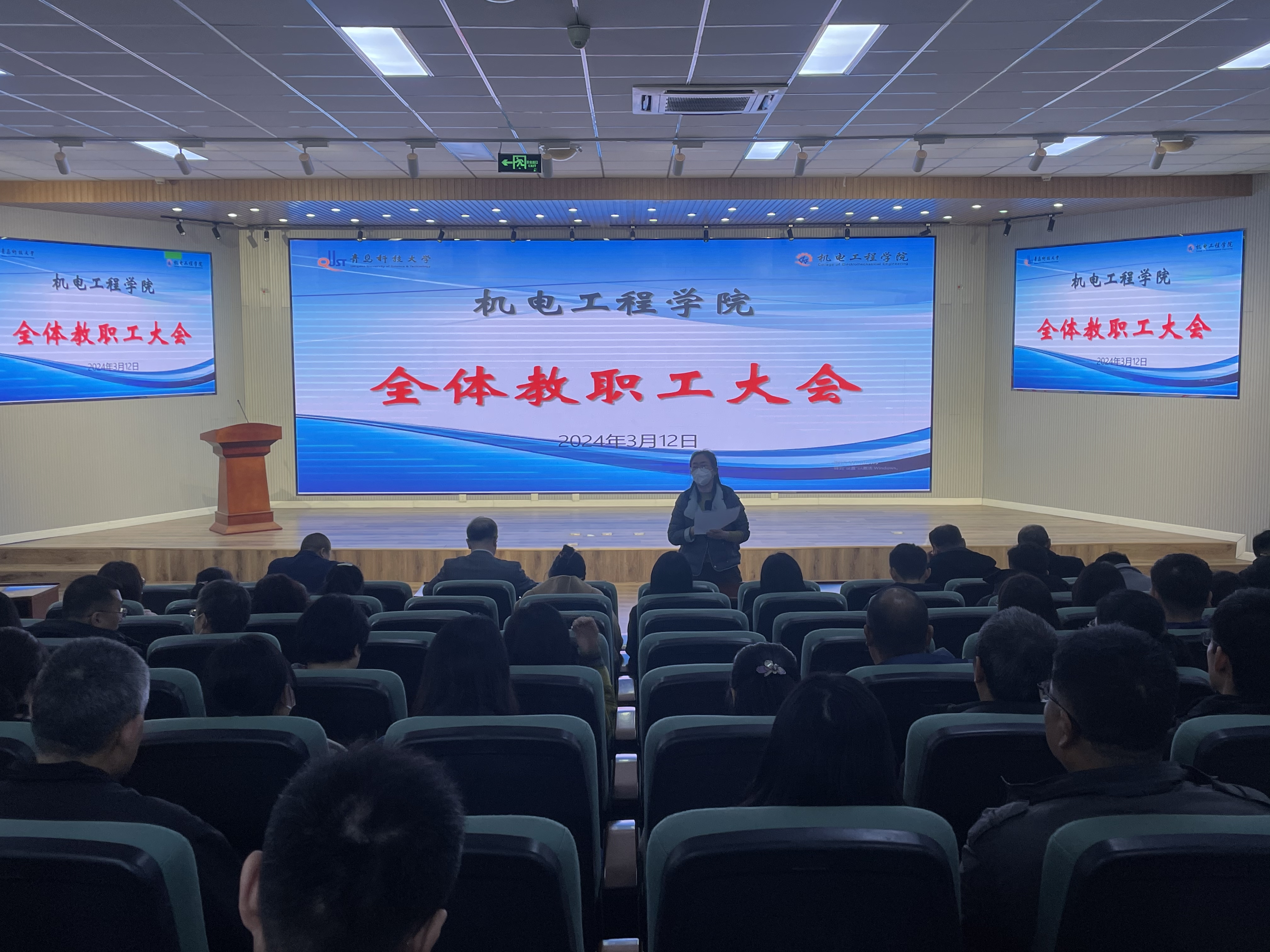 3月12日,机电工程学院召开学院教职工大会,传达学校2024年工作会议精神,学习学校2024年工作要点,部署学院2024年重点工作。