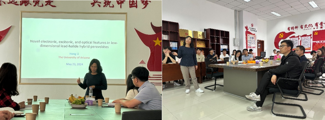 5月23日,美国亚利桑那大学化学与生物学院Li Hong教授受邀莅临机电工程学院,开展题为“低维铅-卤化物杂化过氧化物中的新型电子、激子和光学特征”的学术报告。山东大学的李元老师、吉林大学的王同辉老师,青科机电新能源科学与工程系的刘治明、王晓君、白文娟、楚电明、李建伟、王雨霄和李慧芳等老师,以及能源动力工程专业的部分研究生到场听取了本次报告。