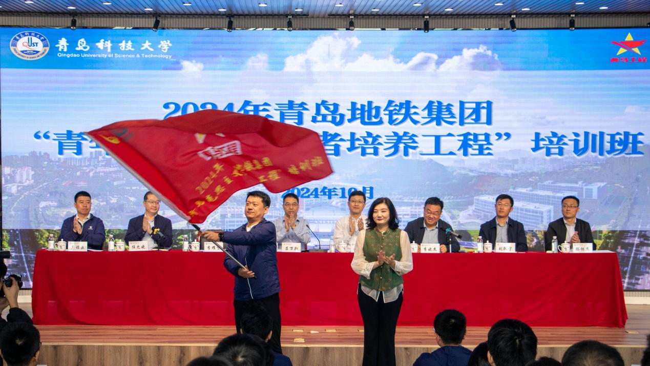 学院党委书记任允晓介绍了培训安排,课程涵盖专题讲座、业务提升、互动体验、分组交流等多个富有吸引力的模块,与青马工程的培养目标高度契合。青岛团市委组织部部长李耀贤为学员代表齐康授旗。青岛地铁李村站区长齐康作为学员代表进行表态发言。