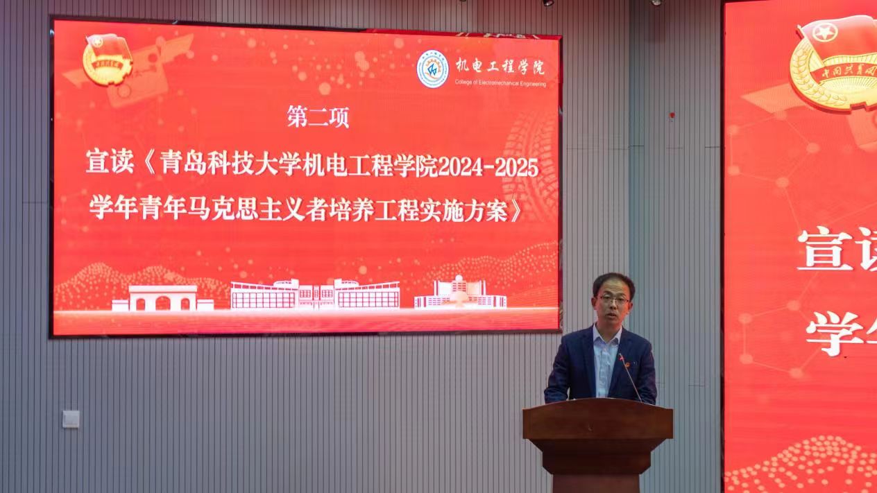仪式在庄严的国歌声中拉开帷幕。院团委书记逄柏鹏宣读了《青岛科技大学机电工程学院2024-2025学年青年马克思主义者培养工程实施方案》,方案中指出,在本次青马工程理论课程的具体设置上充分体现了习近平新时代中国特色社会主义思想铸魂育人作用,关键是帮助青年学生进一步增强“四个意识”、坚定“四个自信”、做到“两个维护”,引导青年学生在“大思政课”中受教育、长才干、做贡献,坚定不移听党话、跟党走。