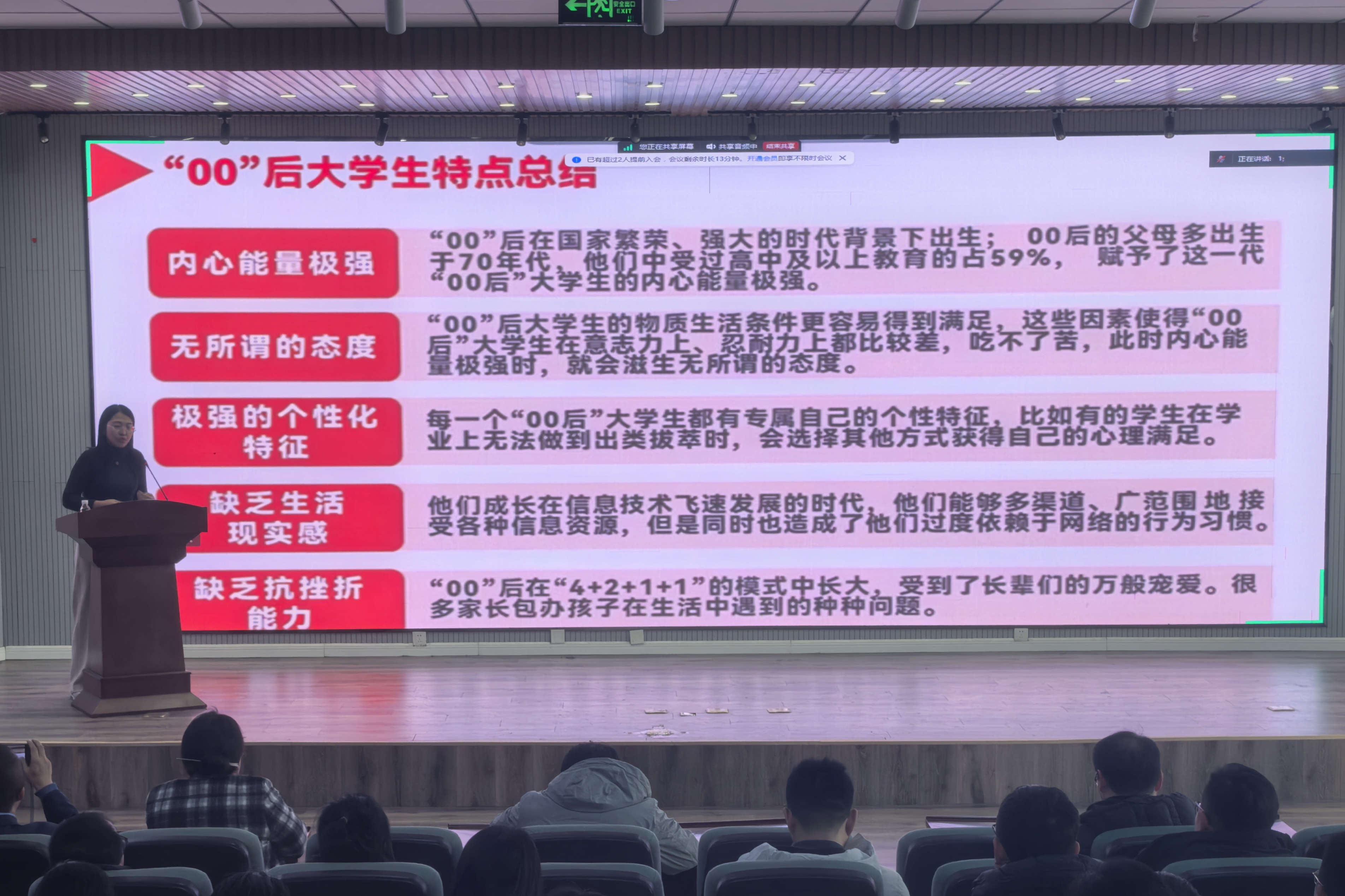 崔瑛针对学生心理健康教育进行专题培训,崔瑛结合心理帮扶“1+N”工作体系,强调班主任是高质量落实学校“1+N”心理帮扶体系中的关键一环,班主任要经常深入学生,全面了解学生的家庭情况、兴趣爱好、学习生活表现等基本情况,塑造学生健全的人格和良好的思想道德品质。崔瑛还向班主任推荐了焦点解决方法在高校学业困难学生辅导中的应用,为各班主任提供了实用有效的心理辅导工具和方法。