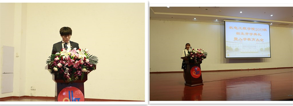 在校生代表机电工程学院学生会主席李大志和新生代表吴紫薇分别在会上发言。