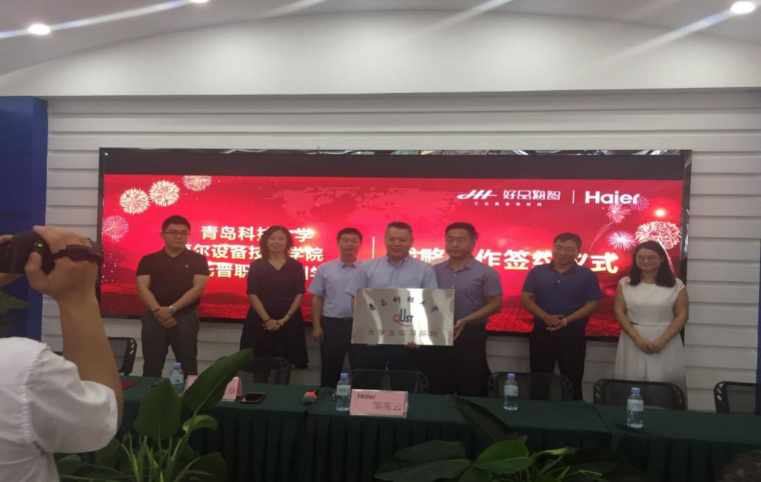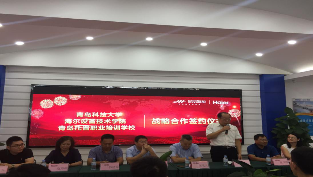 9月12日,青岛科技大学与海尔设备技术学院、青岛托普职业培训学校战略合作签约仪式暨青岛科技大学大学生实习基地挂牌仪式在海尔工业园隆重举行。青岛科技大学机电工程学院党总支书记孙立军、海尔设备技术学院院长邹兆云、青岛市大学生创业服务中心主任褚庆柱、青岛托普集团总经理王敏燕等共同出席签约仪式并致辞。