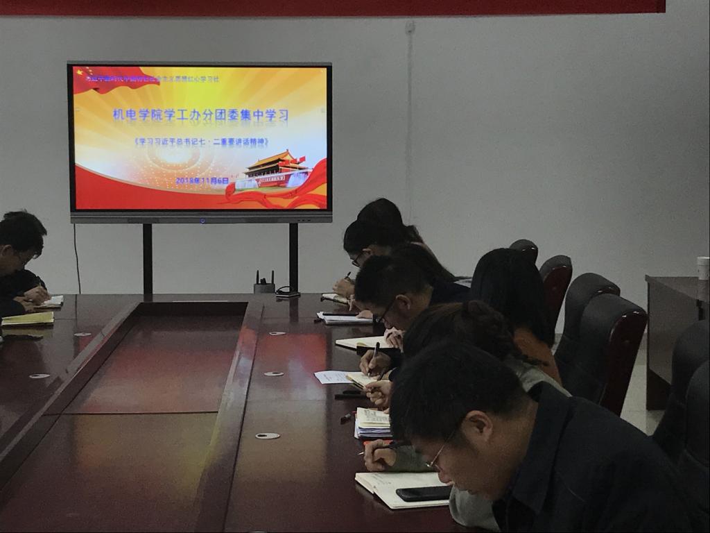 11月6日上午,机电学院习近平新时代中国特色社会主义思想红心学习社在D3-518会议室组织集中学习习近平总书记在同团中央新一届领导班子成员集体谈话时的重要讲话精神。分团委书记王作辉和全体专职辅导员参加会议,会议由王作辉主持。