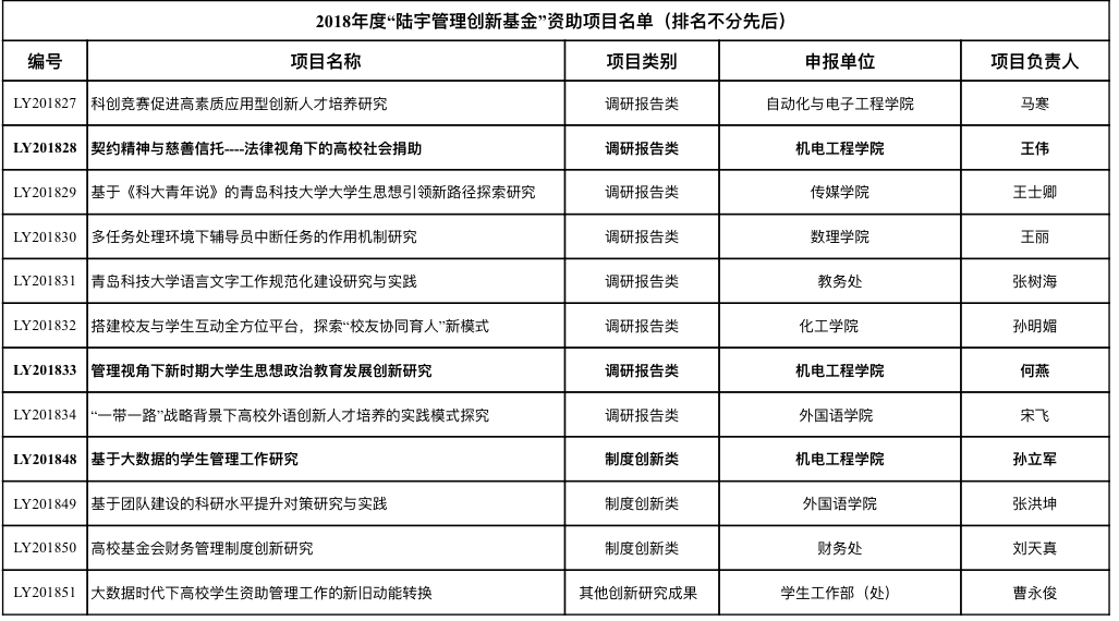 近日,学校下发《关于2018年度“陆宇管理创新基金”资助项目公示的通知》,机电学院申报的项目《契约精神与慈善信托----法律视角下的高校社会捐助》、《管理视角下新时期大学生思想政治教育发展创新研究》和《基于大数据的学生管理工作研究》获学校 2018年度“陆宇管理创新基金”资助。