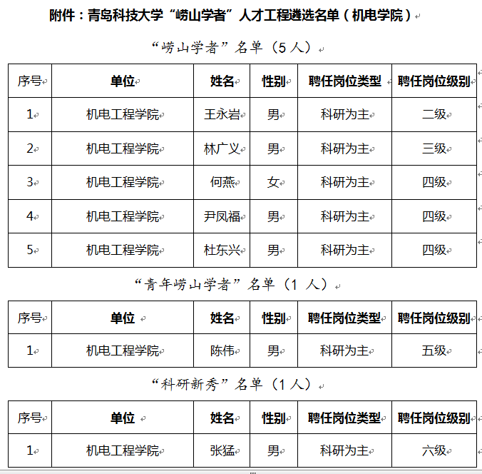 近日,学校公布青岛科技大学“崂山学者”人才工程遴选公示名单,机电学院7名老师榜上有名,王永岩、林广义、何燕、尹凤福、杜东兴5名老师获“崂山学者”荣誉称号;陈伟老师获“青年崂山学者”荣誉称号;张猛老师获“科研新秀”荣誉称号。