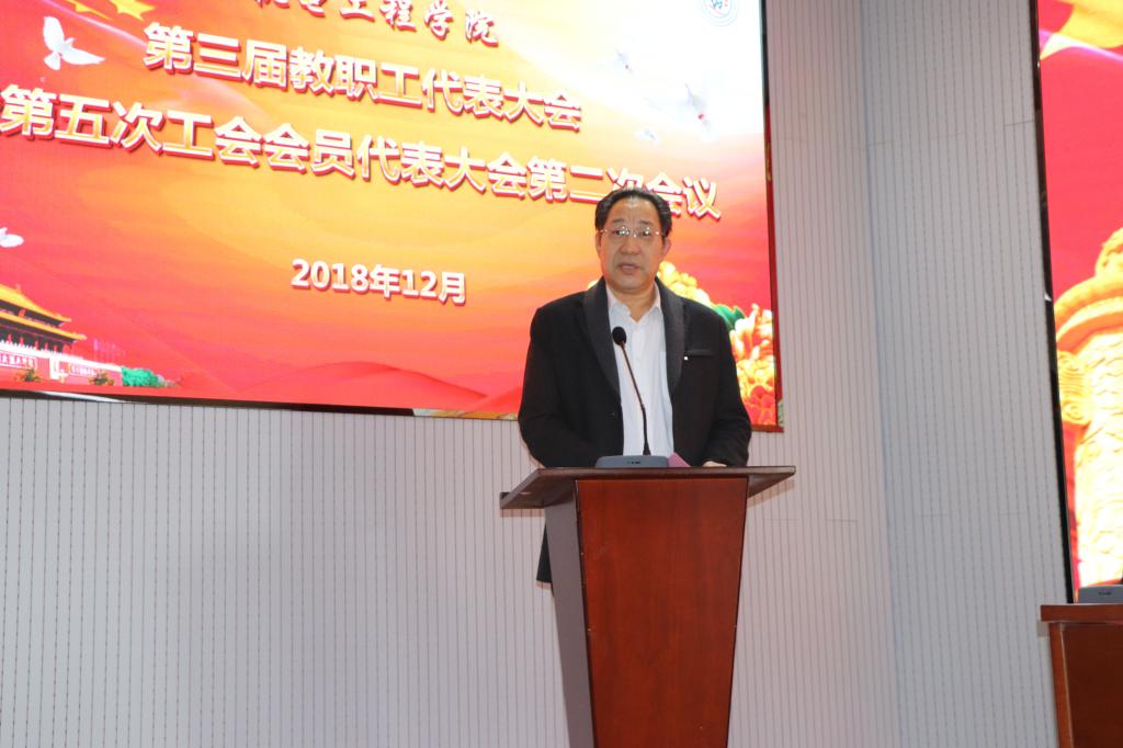 大会在雄壮的国歌声中开幕。韦殿华代表学校党委领导向大会的胜利召开表示热烈的祝贺。他肯定了机电学院取得的成绩,并提出了三点希望,一是提高思想认识,狠抓落实、抓转化,坚持“四个意识”,为建设“双一流”和“五有”高水平大学建设奋斗目标而奋斗;二是坚守初心使命,推动学院发展;三是坚持以人为本,推动民主政治建设。