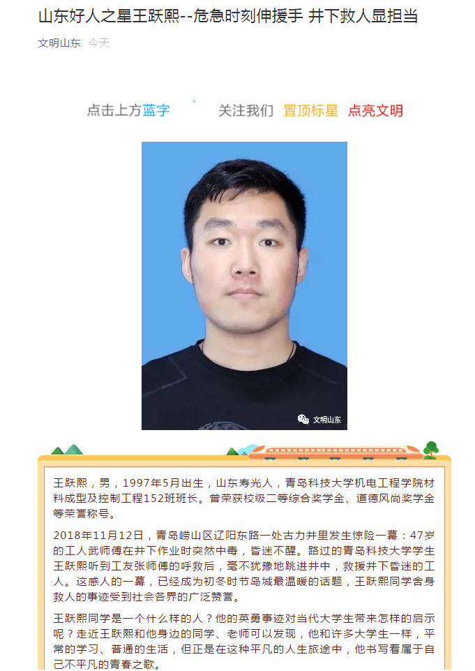 近日,我院成型中韩152班班长王跃熙同学获评山东好人之星。王跃熙同学在危急时刻伸出援手,英勇井下救人,受到社会各界广泛赞誉,展现了新时代机电学子新青年新形象。