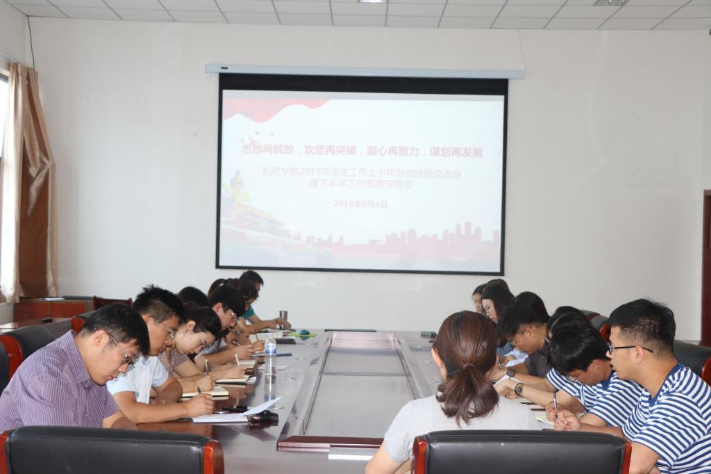 9月2日-9月4日,机电工程学院举行“思想再解放、攻坚再突破、凝心再聚力、谋划再发展” 学生工作上半年总结经验交流会暨下半年工作部署安排会,院党总支副书记兼副院长王伟、院分团委书记兼学工办主任王作辉及全体专兼职辅导员参加了会议。