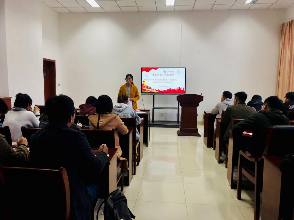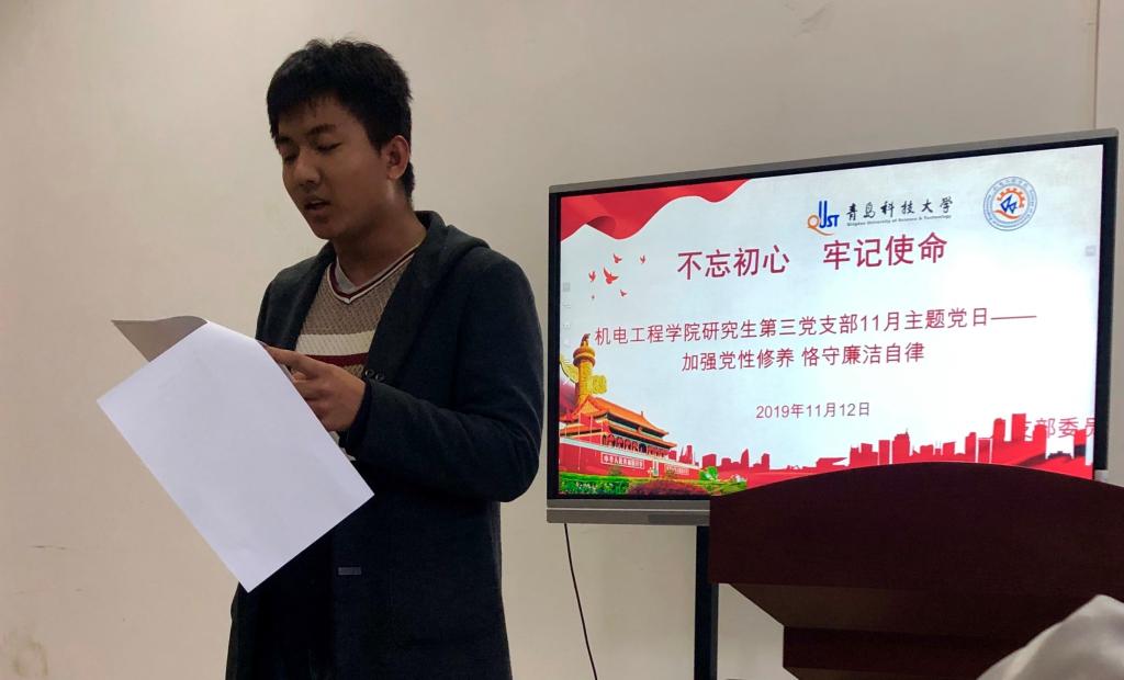 根据学校“不忘初心、牢记使命”主题教育要求,11月12日下午,机电工程学院研究生第三党支部在机电楼529会议室开展“加强党性修养、恪守廉洁自律”专题教育活动,会议由学院党总支副书记兼副院长、支部书记王伟主持。
