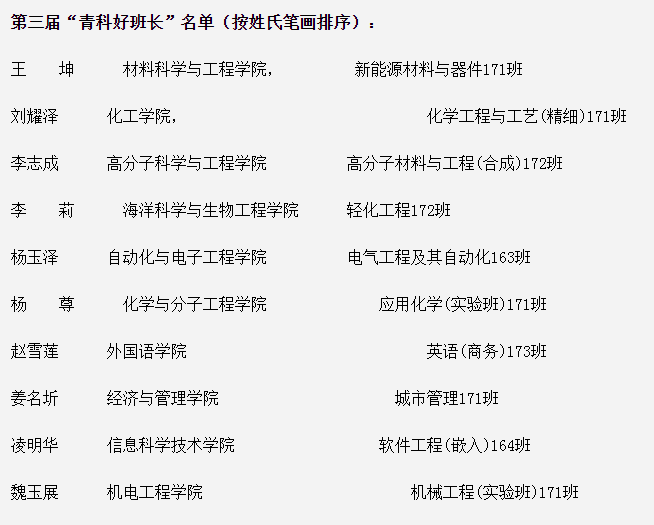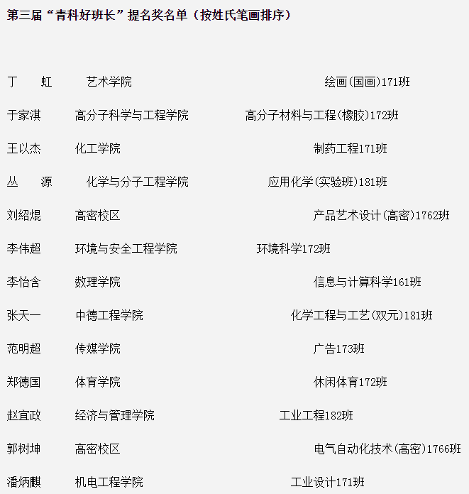 近日,学校公布的青岛科技大学第三届“青科好班长”评选结果中,机械工程(实验班)171班魏玉展荣获第三届“青科好班长”,工业设计171班潘炳麒荣获第三届“青科好班长”提名奖。