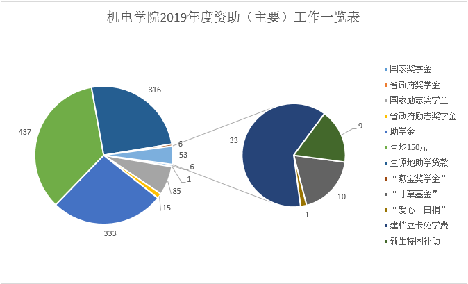 机电学院2019年度共6人获国家奖学金,1人获省政府奖学金,85人获国家励志奖学金,15人获省政府励志奖学金,333人获国家助学金,33人完成建档立卡免学费申请,1人获“爱心一日捐”,6人获“燕宝奖学金”,9人获新生特困补助,10人获“寸草基金”,437人获得2019年春季学期国家助学金生均增加150元,316人获生源地助学贷款,18人顺利完成暑期“校县结对”志愿服务考核。