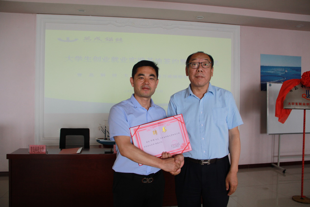 仪式上,孙立军为仲辉颁发青岛科技大学机电工程学院创业导师聘书,肖强与仲辉签订《大学生就业创业实践基地协议书》,张卫锋与仲辉共同为大学生就业创业实践基地揭牌。