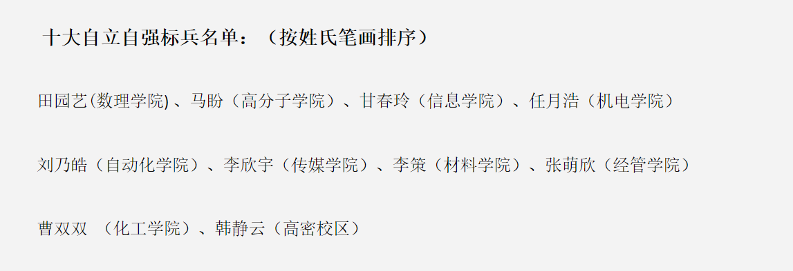 根据《青岛科技大学“十大自立自强标兵”评选办法》,我校自2020年6月启动第十六届“十大自立自强标兵”评选活动,经学生申请、学院推荐与公示、学校审核、网络展示、投票(易班)、专家评审等程序,现评选公示中,我院任月浩同学入选。
