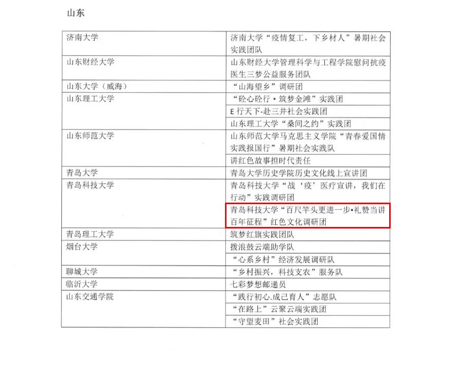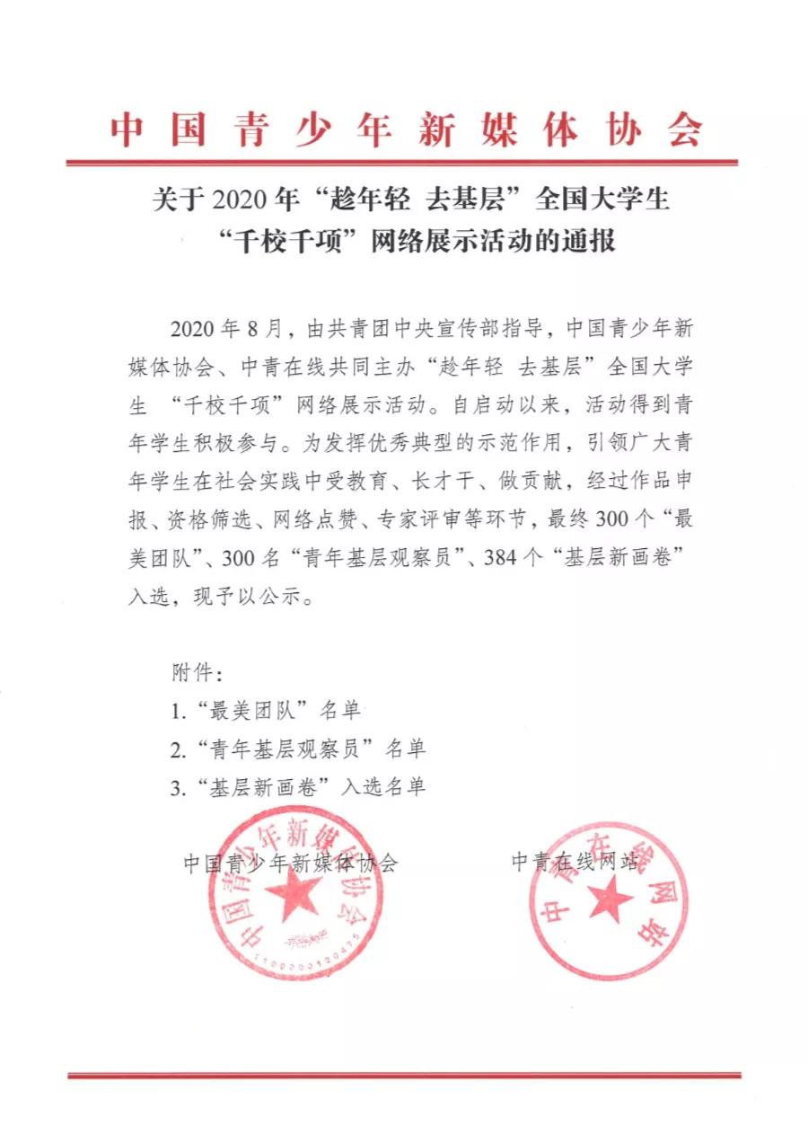 近日,由共青团中央宣传部指导,中国青少年新媒体协会、中青在线共同主办的“趁年轻 去基层”全国大学生“千校千项”网络展示活动顺利举行。自启动以来活动得到青年学生的积极参与,经过作品申报、资格筛查、网络点赞、专家评审等环节,最终在《关于2020年“趁年轻 去基层”全国大学生“千校千项”网络展示活动的通报》中,我院耿宇轩同学带领的青岛科技大学“百尺竿头更进一步·礼赞党建百年征程”红色文化调研团获评此次活动“最美团队”荣誉称号。