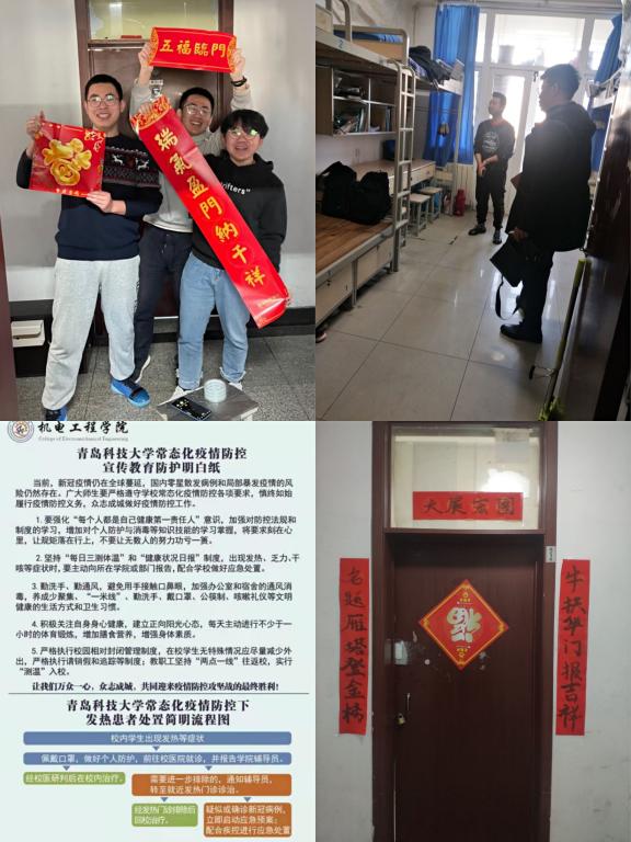 提高疫情防控意识,落实疫情防控要求。根据目前疫情防控常态化形势和学校疫情防控要求,在学生宿舍张贴青岛科技大学常态化疫情防控宣传教育防护明白纸和发热患者处置简明流程图,提高学生放假前的疫情防控和冬季传染病防治的认识和预防。
