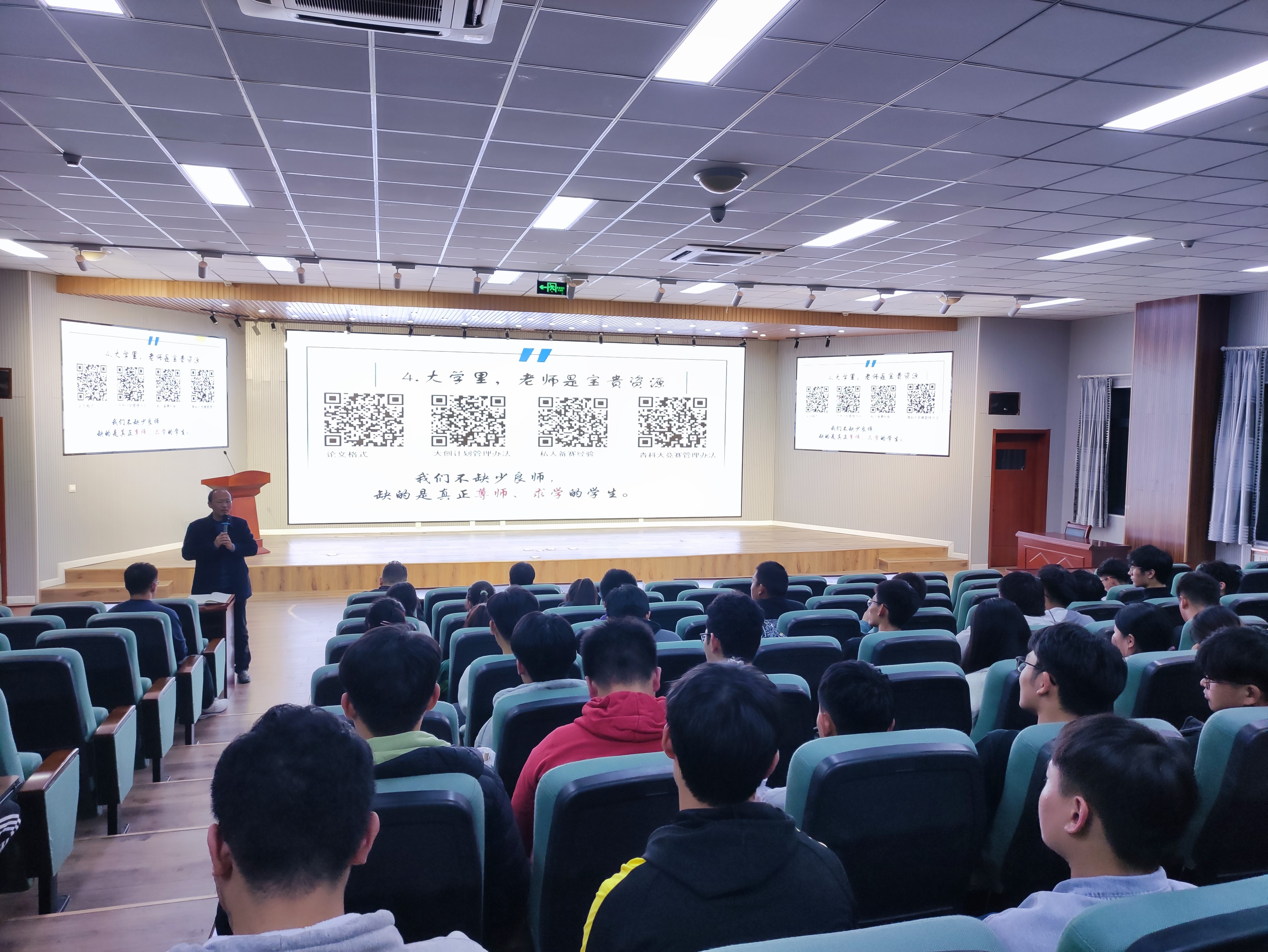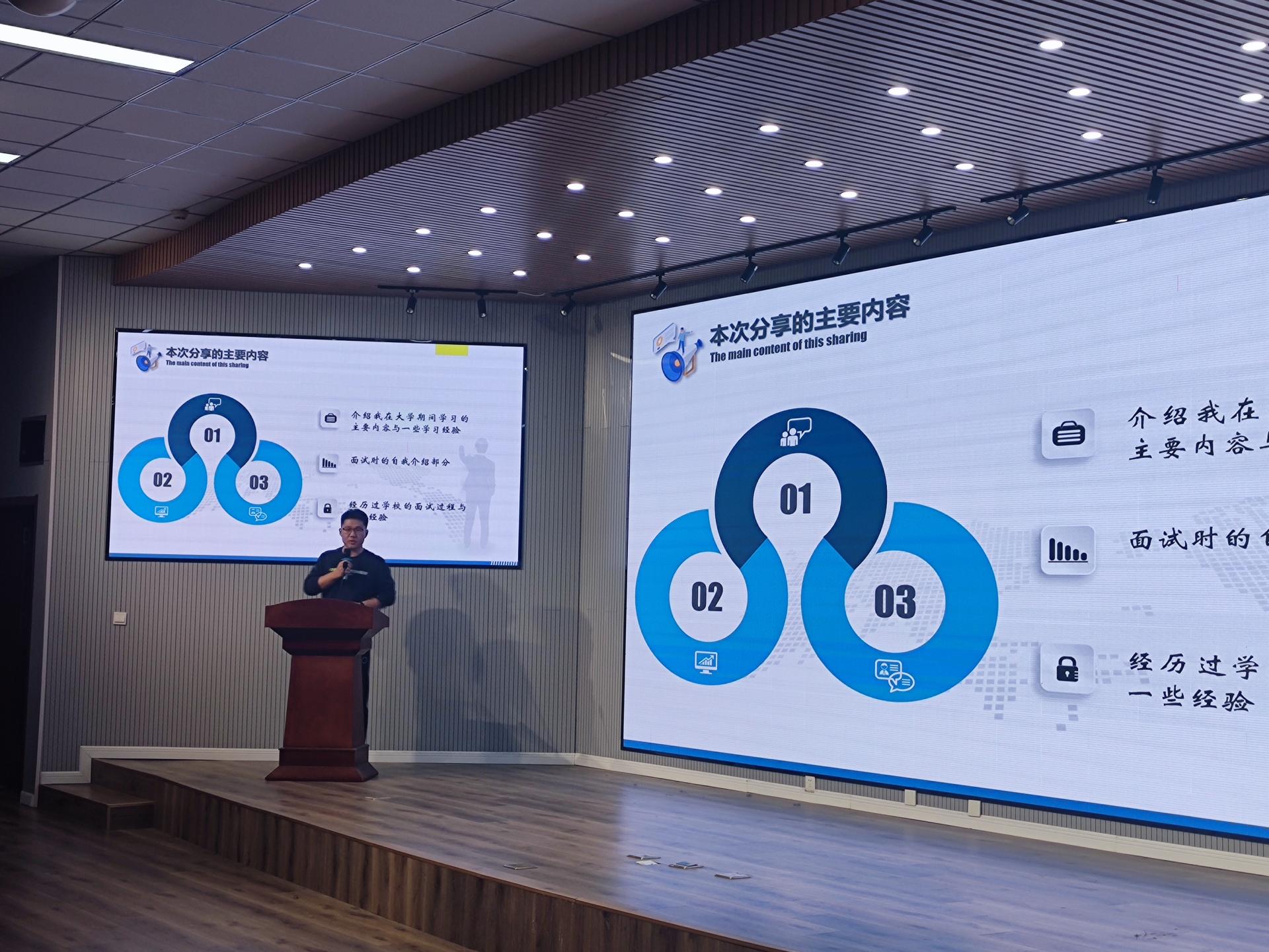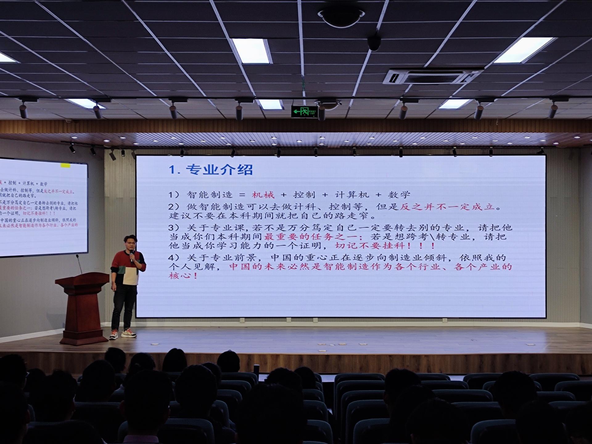 从霄,智能装备181班学生,现保送至山东大学控制工程专业。从宵同学首先介绍了自己对于智能制造专业的理解以及对其未来的展望,之后介绍了一系列认为同学们有必要在大学期间进行深入学习的软件,建议打好机械、控制、计算机及数学基础和相关技能。之后,从霄同学又结合自身经验,向同学们介绍了一些在大学期间含金量比较高的竞赛,主张通过“以赛代练”的形式来提高同学们的专业技能。之后从霄同学有关于是否考研、是否跨考、如何择校、考研时间线规划等问题分别展开,讲述了自己的观点。最后,从霄同学关于英语四六级的问题与同学们进行了深入交流。