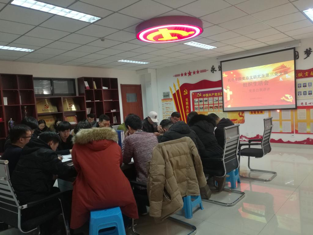 为落实学校党委组织部《关于召开基层党支部组织生活会及2018年度党内评议评优工作的通知》要求,1月8日下午,机电学院研究生第三党支部在机电学院楼505党建活动室召开组织生活会。