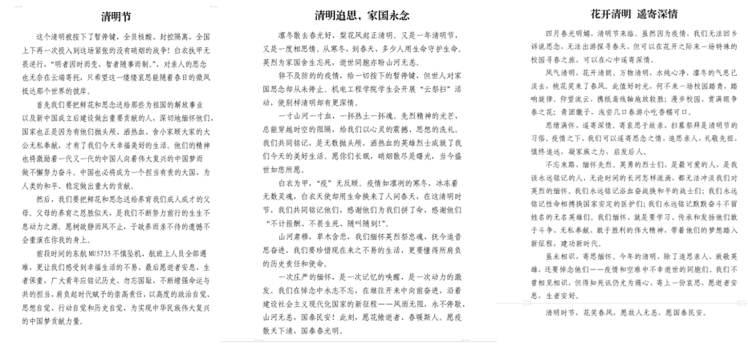 天地英雄气,千秋尚凛然——机电学院学生会开展“清明寄哀思”征文活动。组织学生们以笔寄情,与英烈对话,提高思想觉悟,坚定理想信念,汲取不畏强敌、不畏风险、敢于斗争、奋勇向前的勇气与力量。