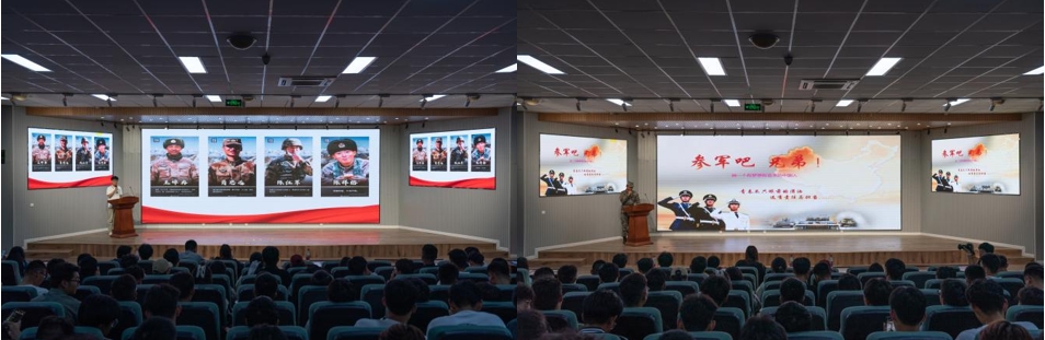 10名选手演讲结束后,征兵宣讲团代表刘易、宋安昱通过自身经历分享和当下国家政策分析,向同学们描绘了真实部队中的生活,同时鼓励同学响应国家号召应征入伍,在军队中实现自己保家卫国的理想与抱负。