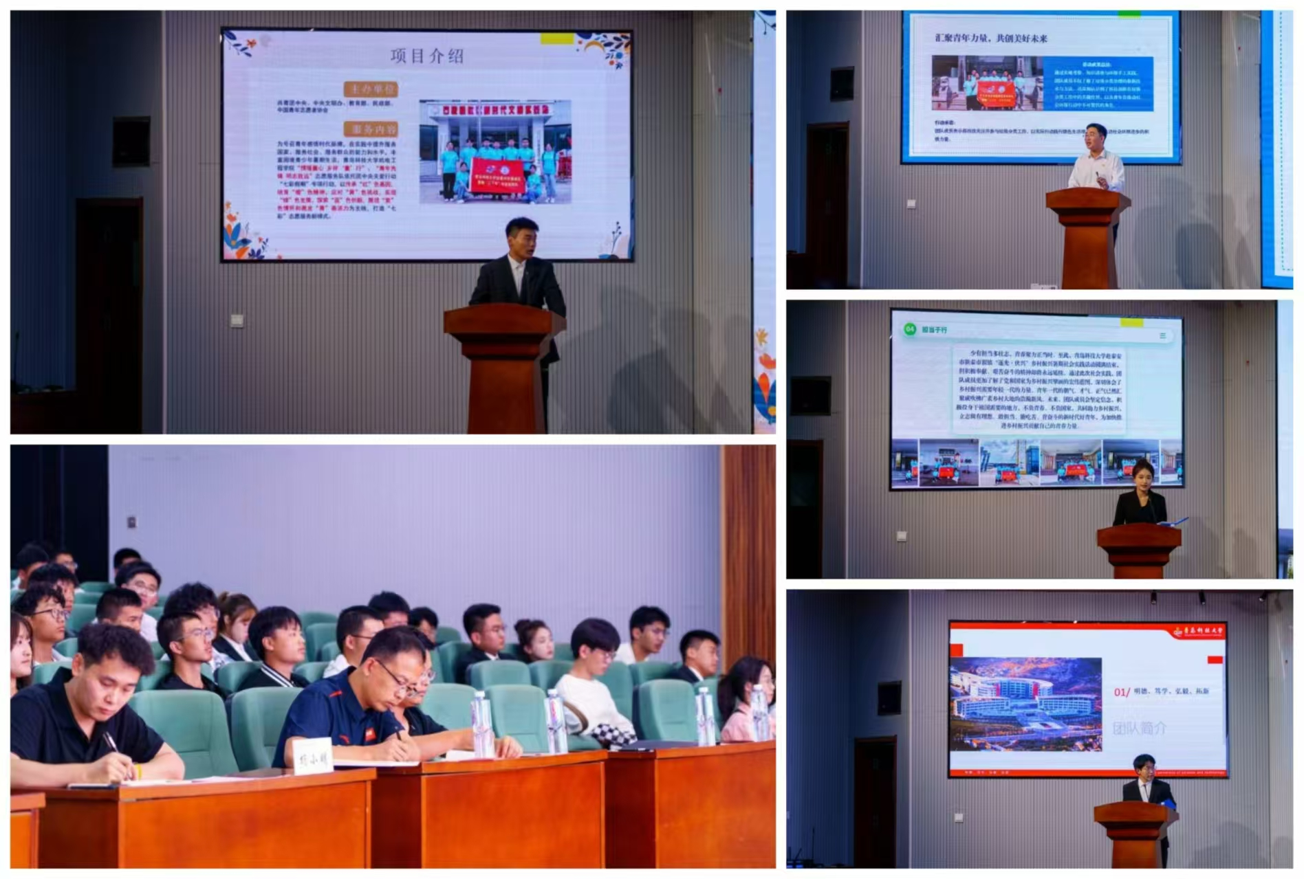 “青年强,则国家强。”本次活动共有9支团队参与答辩环节。团中央专项“七彩假期”代表郭力广同学,校级重点团队代表朱小琦、丁尉宸、侯昕泽、李世熜、王雨柔、张哲、杨桐、崔振华依次登台。从乡村振兴到工厂科创,从党史学习到绿色生态,都浸染在机电学子用实际行动所勾勒出的一卷卷青春蓝图。