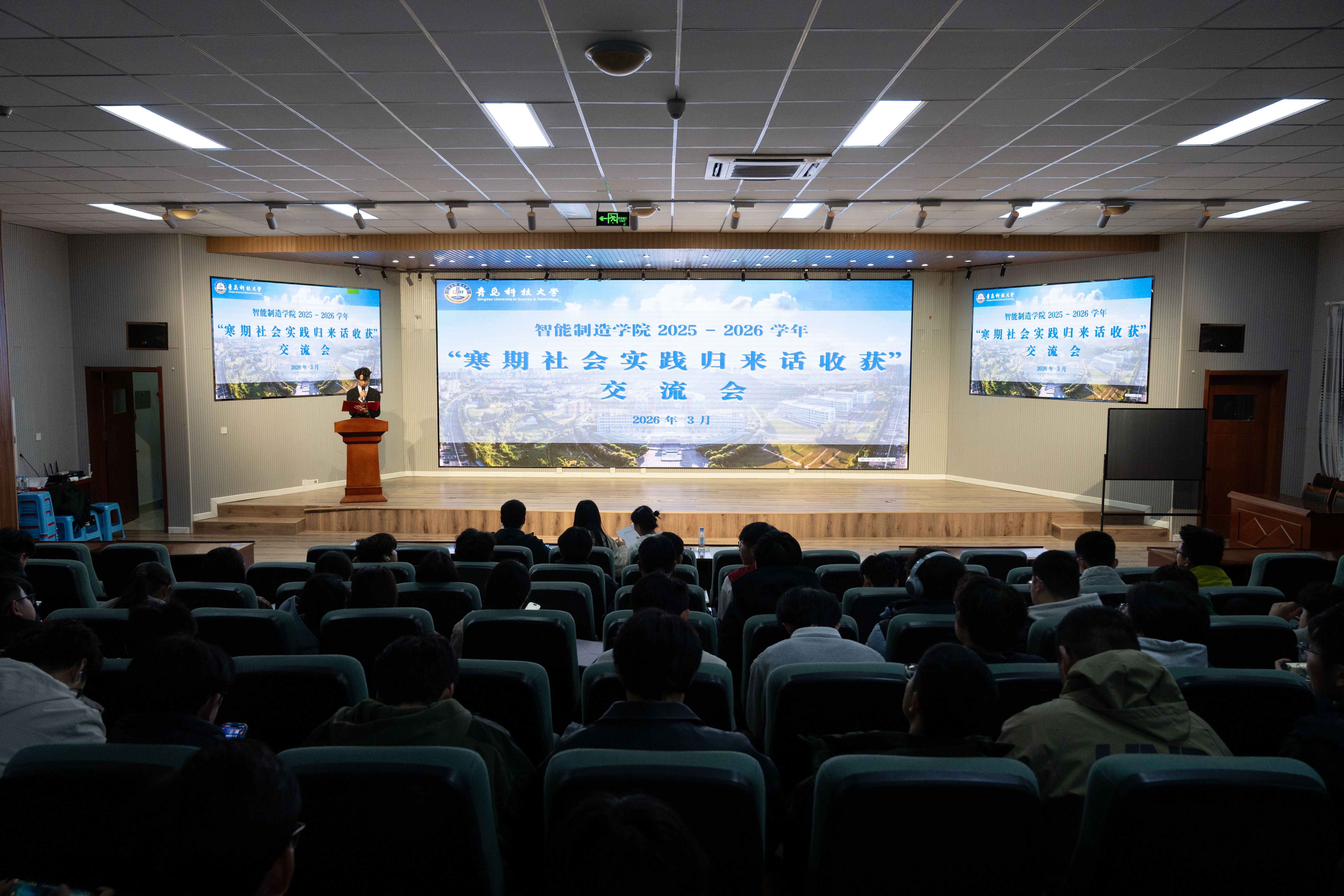 在交流分享环节,8位社会实践优秀学生代表依次登台,结合各自寒期实践经历,围绕实践历程、成果收获与成长感悟展开分享。他们的实践足迹遍布专业企业见习、基层志愿服务、红色基因传承、社会民生调研等多个领域,既有结合智能制造专业特色的产业一线实践,也有扎根社区、乡村的惠民服务行动,既有对时代发展的实地调研思考,也有对青年责任的深刻践行感悟,全方位展现了智能制造学院学子以知促行、以行践知的青春风采。真挚的分享引发在场师生的强烈共鸣。