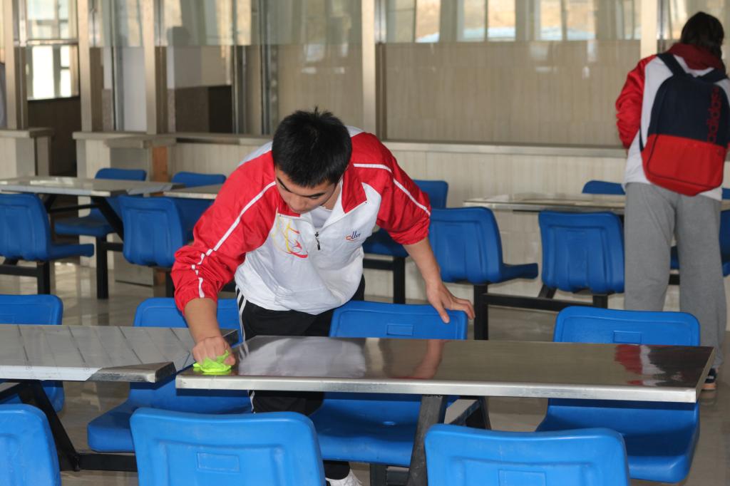 根据本次活动方案及分团委老师们的严密部署,全体志愿者分为两组进行义务清扫。一组负责擦洗桌椅,另一组负责清扫地面,尽管打扫过程很辛苦,但是同学们却热情饱满,做得十分用心,他们秉承着“学习雷锋,弘扬雷锋精神”的理念,不怕脏,不怕累,认真地清扫餐厅三楼的每个角落。通过近一个小时的艰辛劳动,北苑餐厅三楼的环境被干事们清理得干干净净。虽然辛苦,但志愿者们脸上的笑容却依然灿烂,透露出一种幸福的信息,尽管天气还有点寒冷,但是同学们的心里都暖洋洋的。新时代的雷锋精神在机电学院学生会每个成员身上体现了出来。雷锋精神已深深融入到中华儿女建设祖国、奉献社会的热血中,更体现在了当代大学生助人为乐、无私奉献、全心全意为人民服务的活动中。