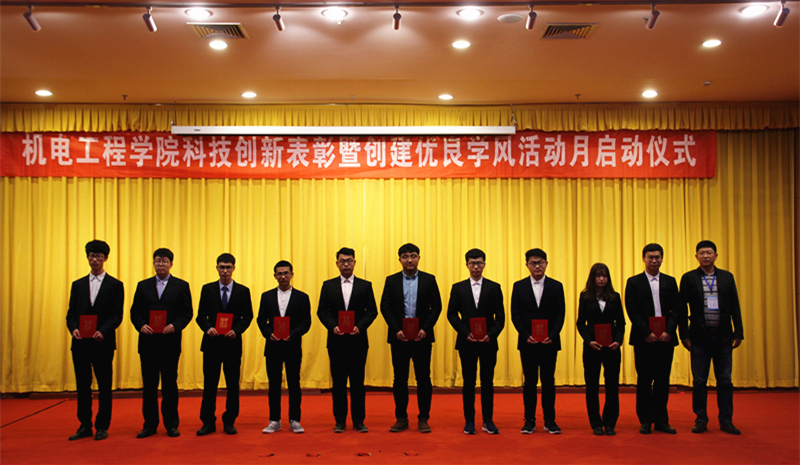 “科技创新表彰暨创建优良学风活动月启动仪式”开始前,老师们和同学们一起认真观看了机电学院“科创嘉年华”的精美视频,感受了科技与创新的魅力。会上,机电工程学院党总支书记孙立军宣读了《关于表彰青岛科技大学机电工程学院大学生科技创新优秀指导教师和科技创新优秀学生的决定》。机电工程学院分团委书记王作辉宣读《机电工程学院2018年五项赛事立项通知》和《机电工程学院创建优良学风活动月》活动方案。孙立军、肖强、尚猛和杨小明分别为获得机电工程学院大学生科技创新优秀指导教师称号的老师和机电工程学院大学生科技创新优秀学生称号的同学颁发证书,并由科技创新优秀先进代表王敏同学分享自身经验。最后,机电工程学院院长何燕总结了学院2017年度大学生科技创新活动和学风建设情况,并对2018年的相关工作进行了再安排再部署。