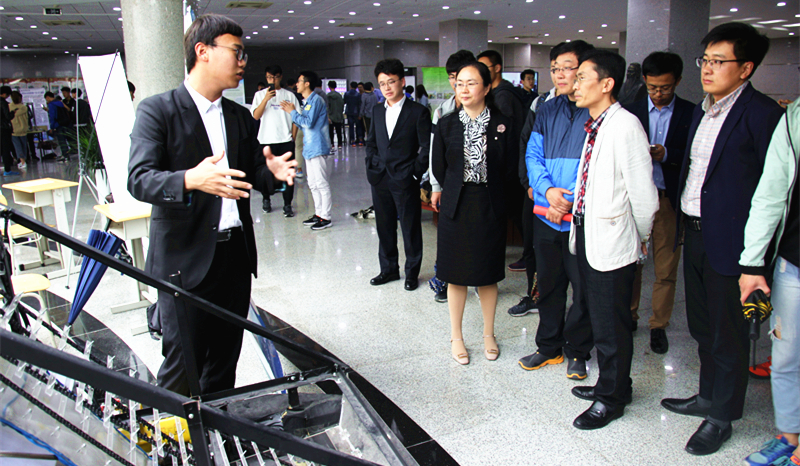 仪式结束后领导们来到图书馆参观展览,本次作品展向大家展现包括了“机器人中心”、“PEC”、“节能减排”和“海狼”四个工作室的作品,积极创新的学生个人的项目和2017工业设计系毕业设计。展览中,参与科创的同学向前来观看的老师、同学们一一详细讲解并演示,认真回答老师提出来的问题,向大家科普各专业的相关知识,也介绍了各优秀作品的创作历程,使大家从不同的角度了解了科创。欣赏过各项科技创新作品后,老师和同学们陆续离开。