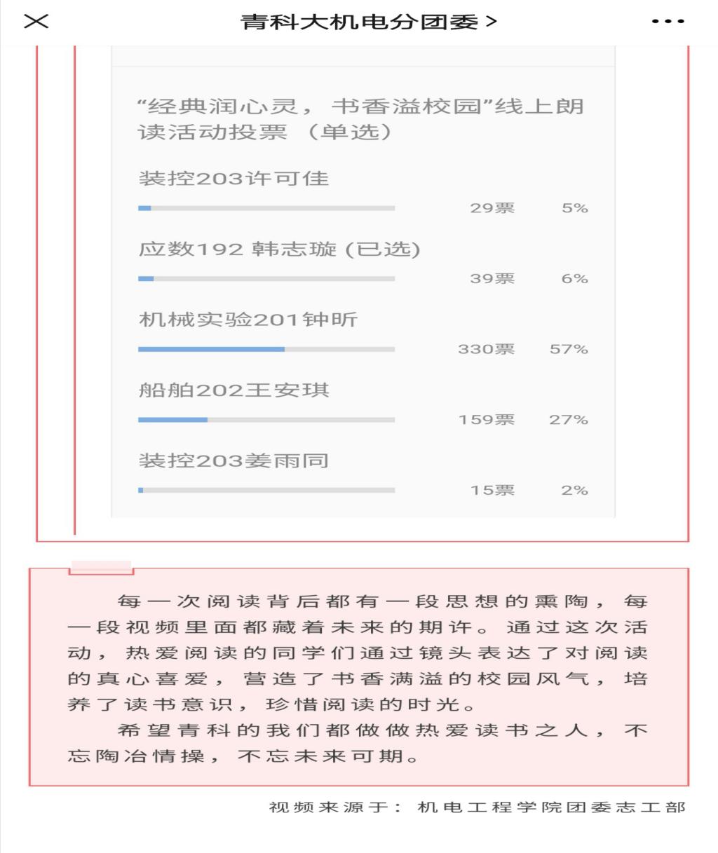 为提高当代大学生的文学素养,厚植爱国主义情怀。11月7日起,机电工程学院团委志工部红心青年志愿者协会面向全体师生举办“书香润心灵,朗读促成长”线上朗读者活动。