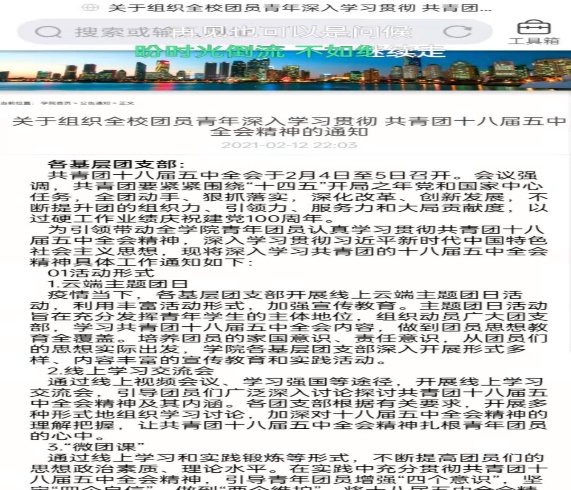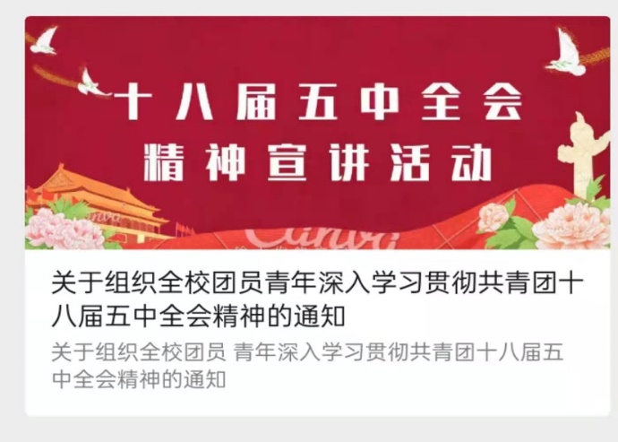 积极开展,遍地开花。自活动开展以来,各团支部通过云端主题团日活动、线上学习交流会、“微团课”等多样形式积极引导团员们广泛深入讨论探讨共青团十八届五中全会精神及其内涵,得到了显著的效果。