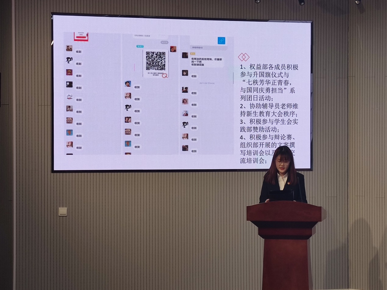 会议第二阶段,为全面落实2020-2021学年度第一学期机电学院学生会的工作开展情况,各部门针对本部的工作情况面向学生会全体同学进行述职汇报 。