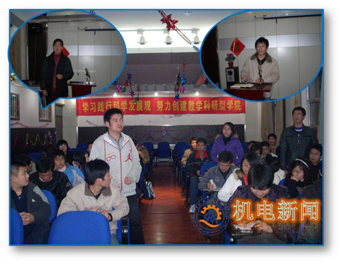 在两会闭幕之后,机电学院积极引导学生学习贯彻两会精神,学习科学发展观,3月14日到19日,机电学院各班级组织召开“学习科学发展观”主题班会,并带领大家学习科学发展观-大学生学习读本。
